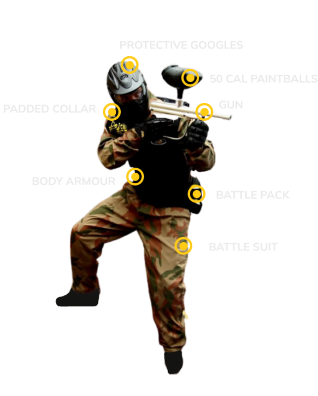 Upon entering our base camp, your combat kit for the session will be provided to you. Everything depicted in the image, excluding the gun, becomes yours at no additional cost when you pay the registration fee.